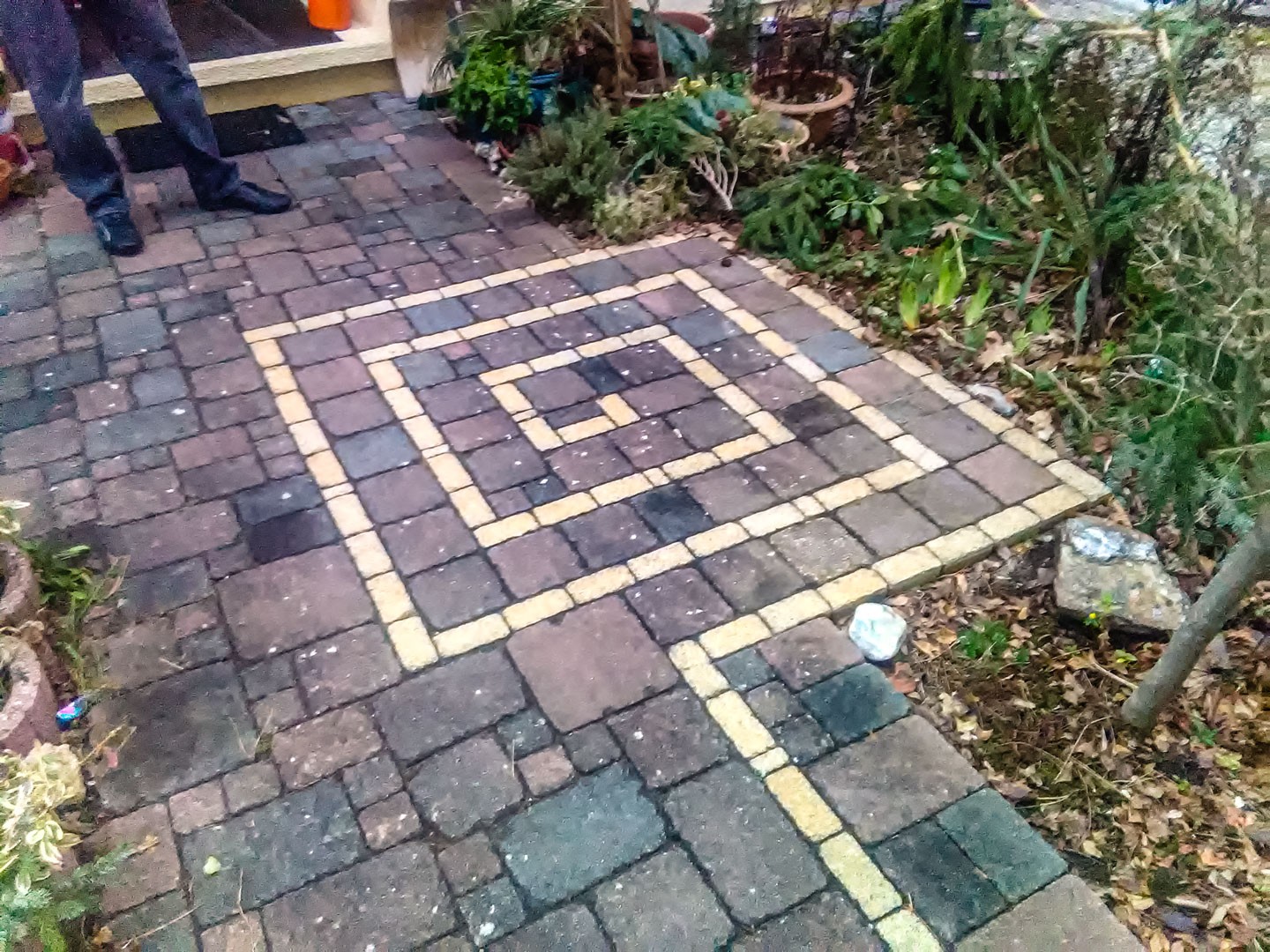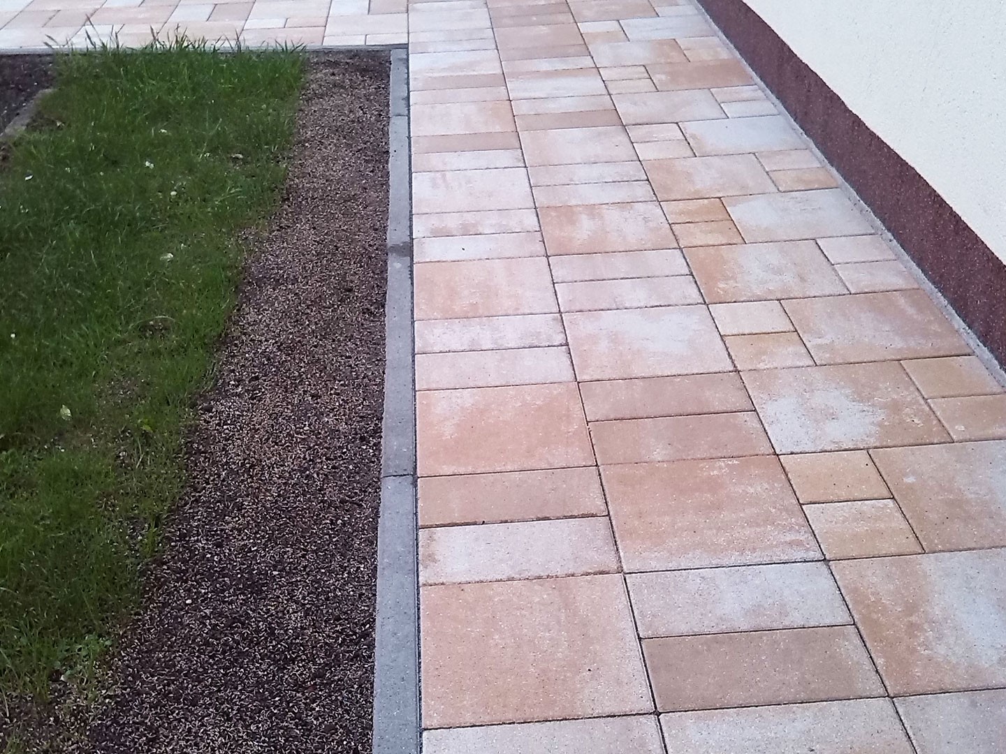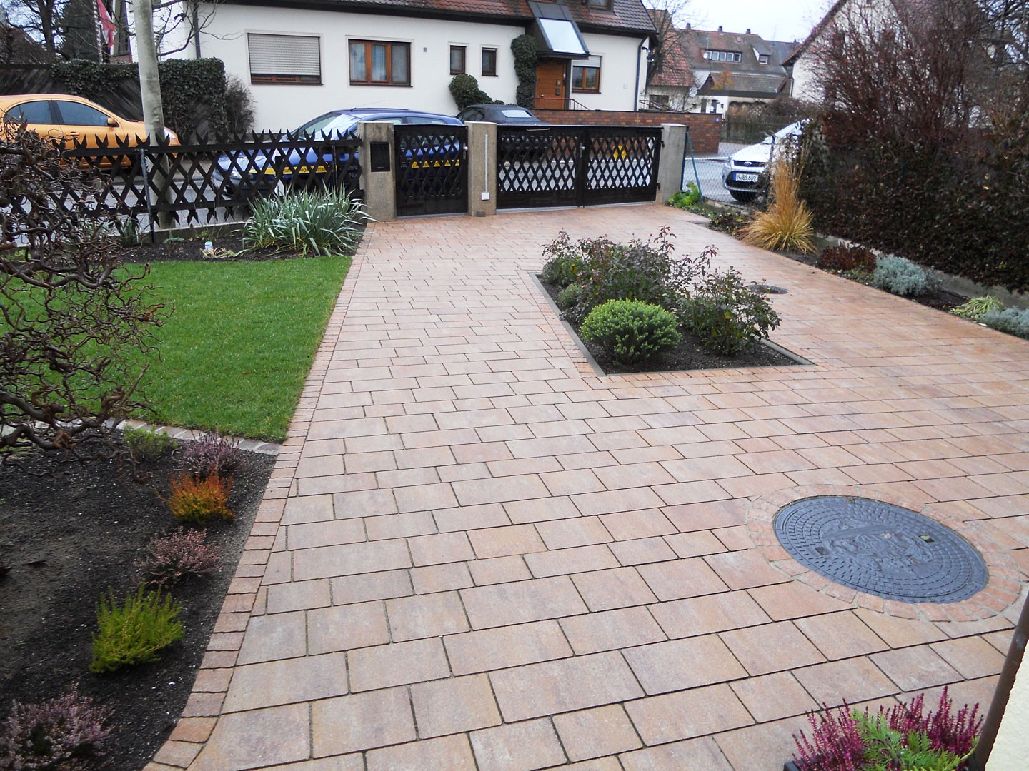 Gartenwege mit Betonsteinen in der Farbe „Sunset“Öffentliche Gehwege mit Begrenzungspfosten