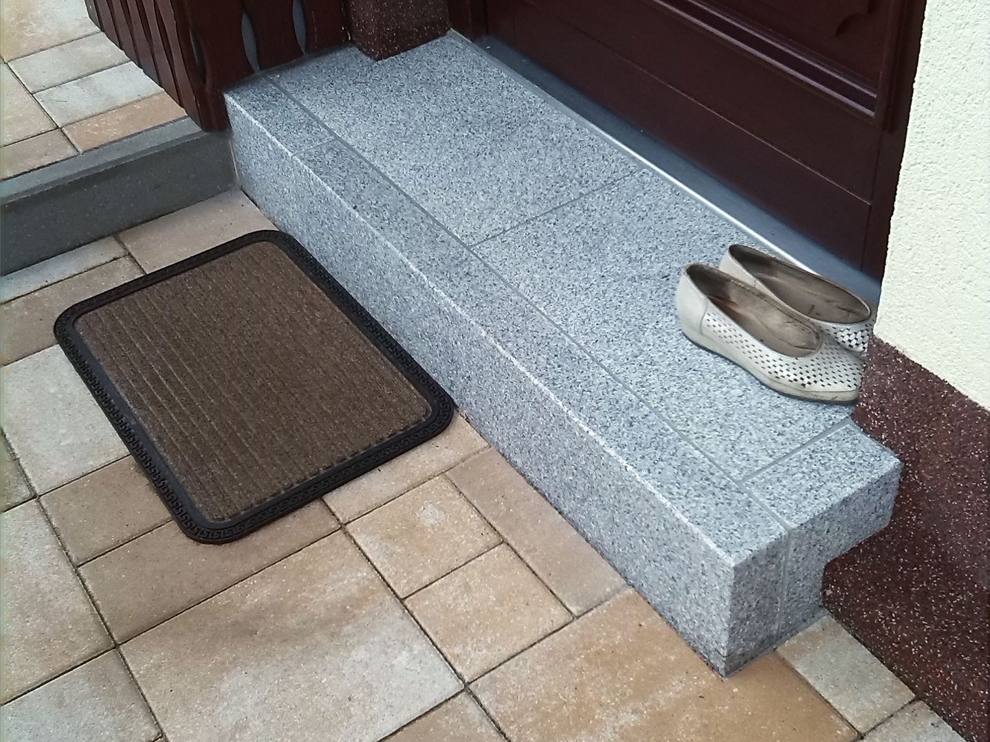 Vorher: Schwierige Haustürstufensituation sollte mit Granit gelöst werdenNachher: Hauseingangsstufe aus Granit als Unikat