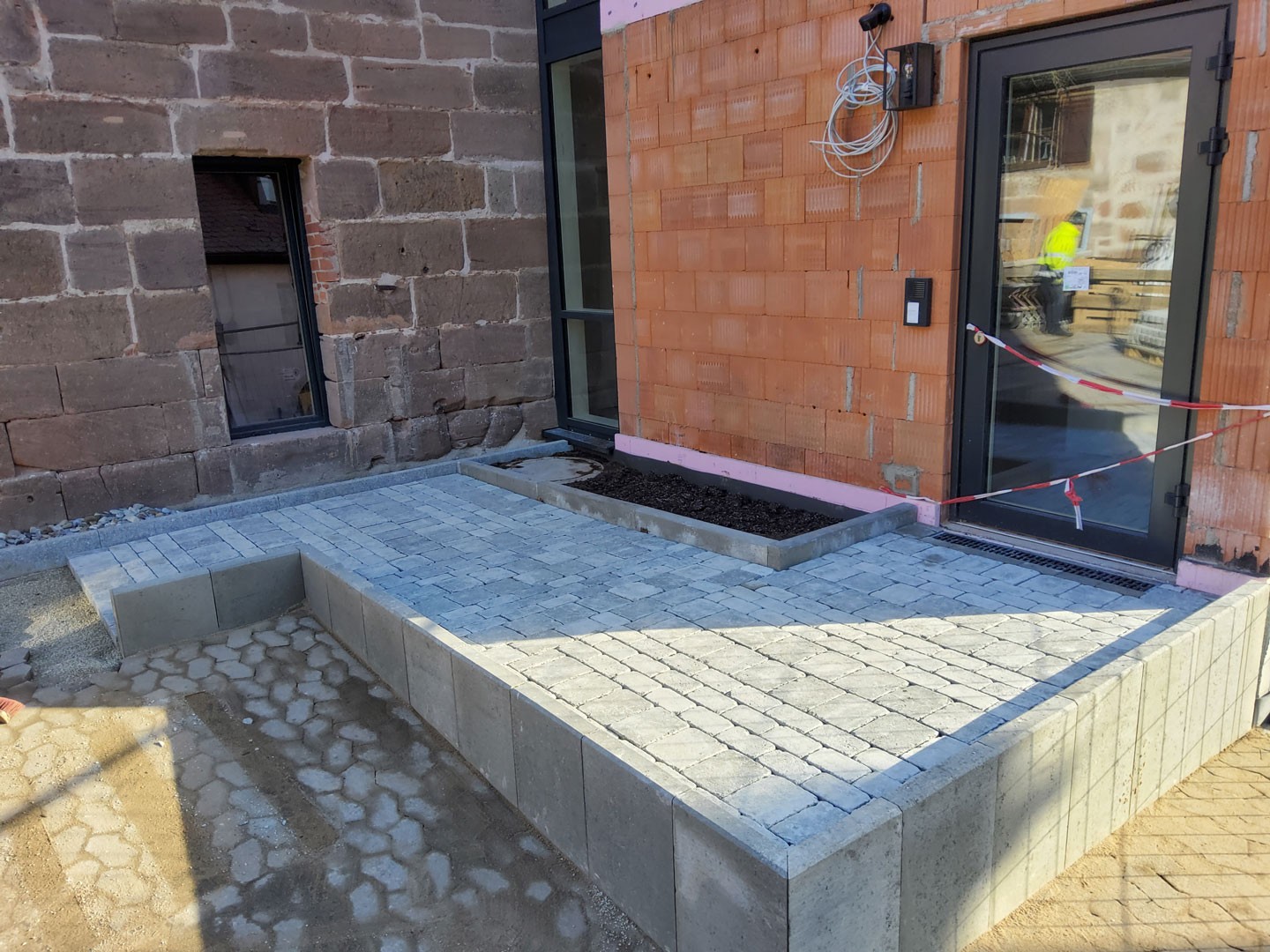 Hauseingänge im Bestand werden meistens echte Unikate. Hier gibt es eine Vielzahl von Umständen zu berücksichtigen: Frostsicherheit, Dichtigkeit des anliegenden Gebäudes, bequemes Begehen usw.