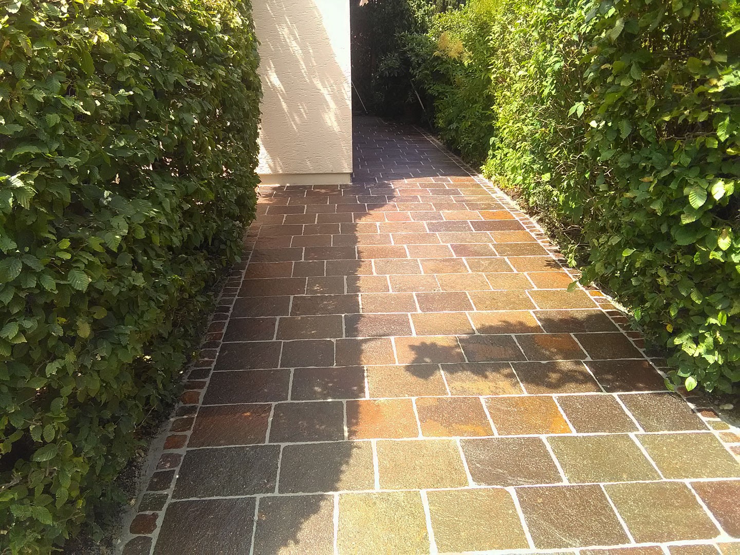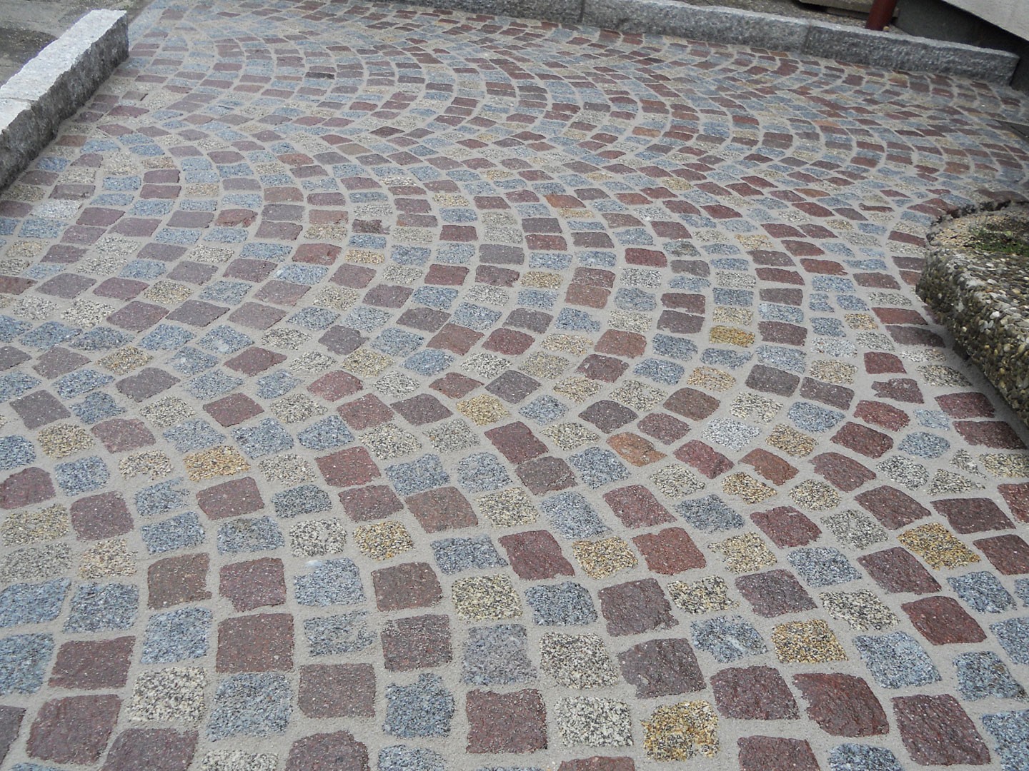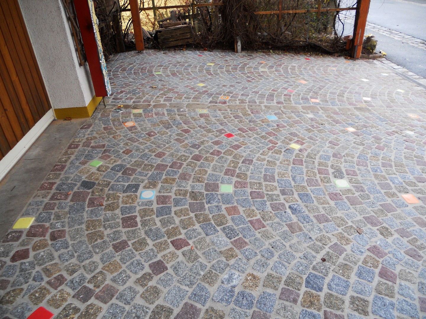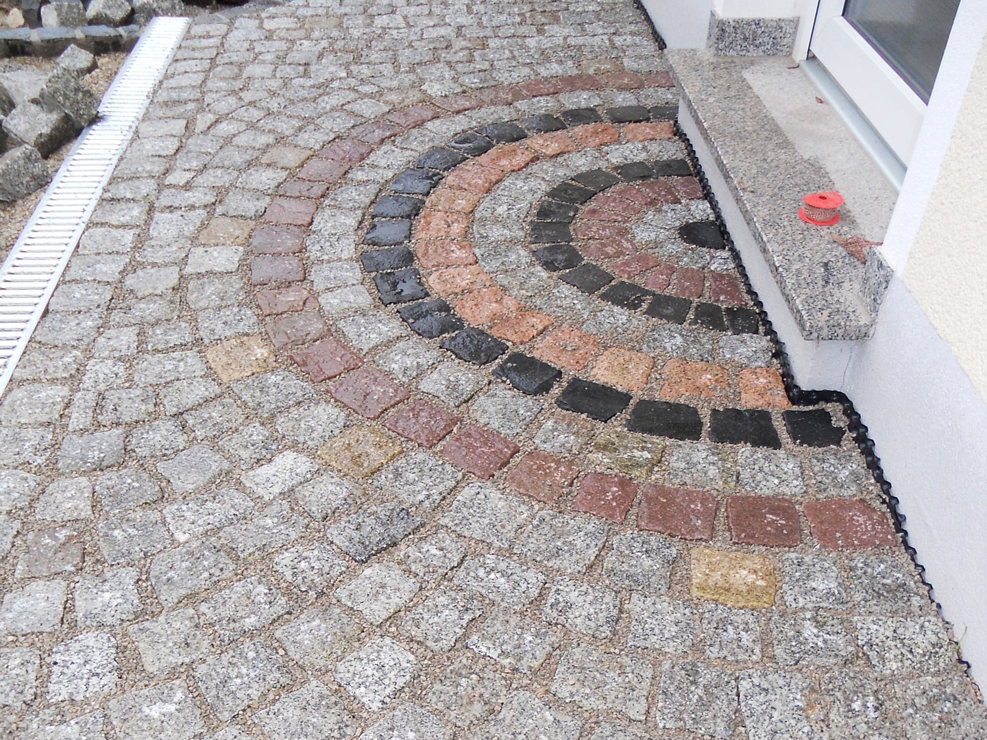 Granitkleinpflasterweg vierfarbigNeugestaltung von vorhandenen Granitkleinsteine in verschiedenen Grautönen beim Kunden