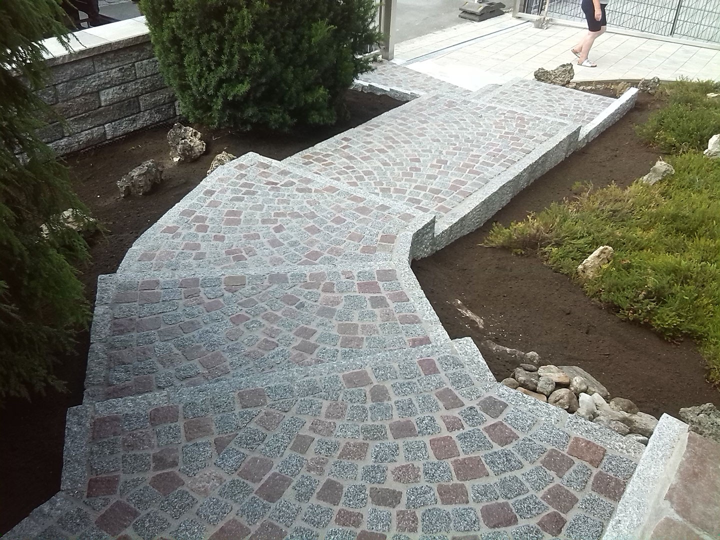 Anschluss an vorhandene Porphyrpolygonalterrasse mit Porphyrkleinpflaster bunt, in Reihen verlegtGewendelte Granit-Treppenanlage „Rotgrau“ mit Granitleisteneinfassung