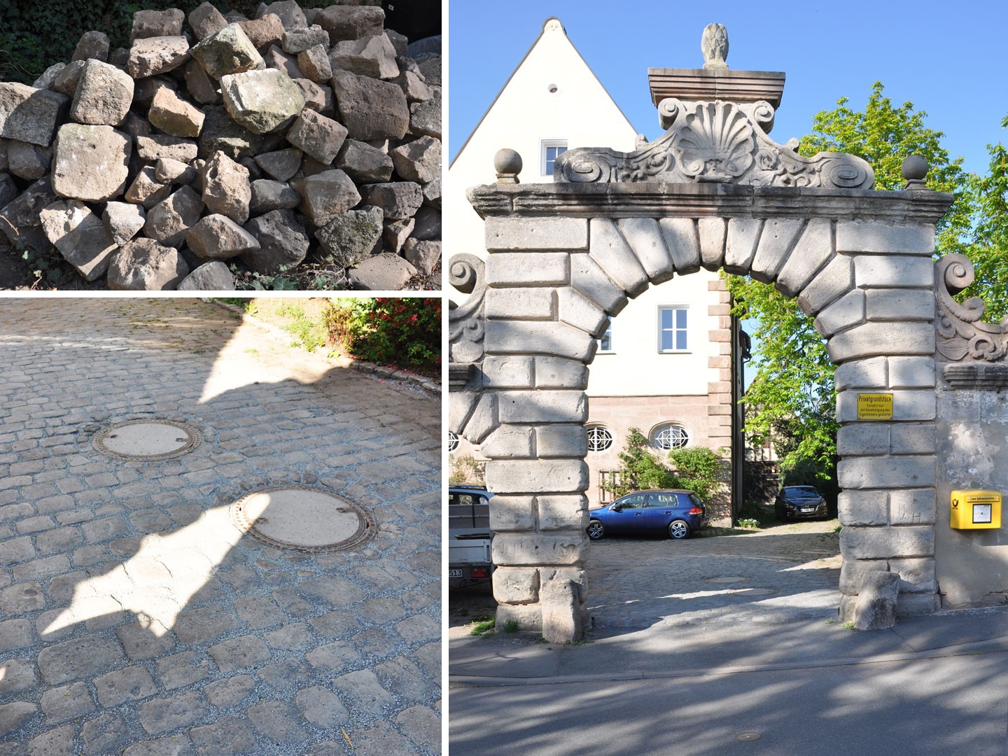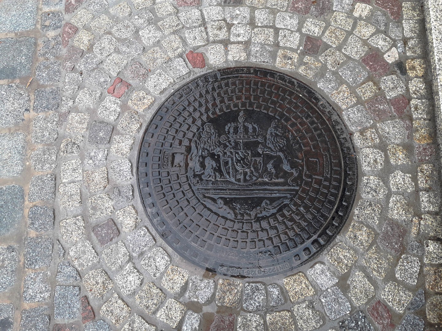 Vorhandenes historisches Wendelsteinpflaster wiederverlegt in privater HofzufahrtKanalschachtdeckel mal anders (Bayernwappen, auch als Frankenwappen möglich)