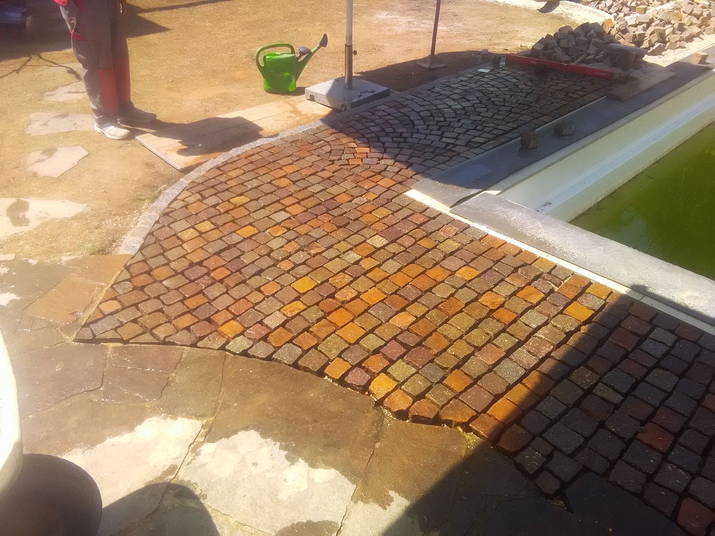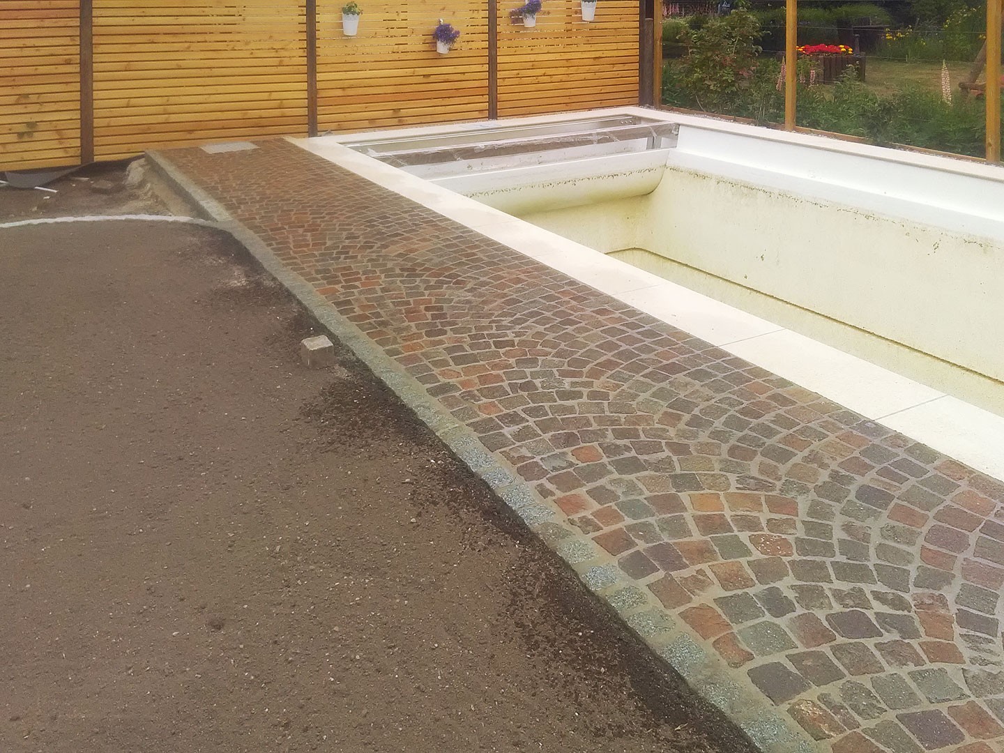 Porphyrplatten als Hauszugang in verschiedensten Formaten mit Porphyreinzeiler und VerfugungPorphyrkleinpflaster bunt im Segmentbogen an Swimming Pool verlegt