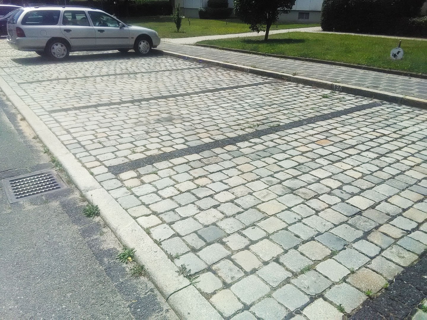 Gehbereich und Fahrbereich mit Pflasterrinne abgetrenntVor über 50 Jahren durch Firma Gries gepflasterte öffentliche Stellplätze, seither dauerhaft in Betrieb