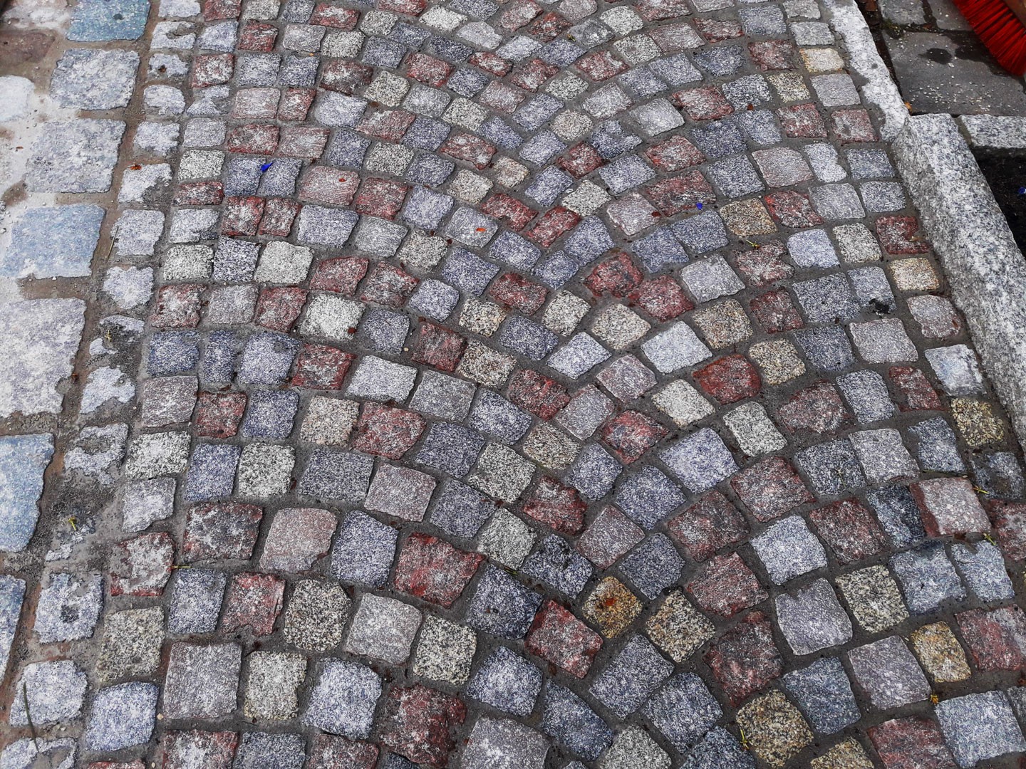 Wendelsteinpflaster aus Urgroßvaters Zeiten exakt dort im Untergrund geborgen und auf das neue erforderliche Niveau gepflastert